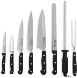 This 6 Piece Wave Birchwood Knife Block Set from Avanti has everything you need to equip your kitchen with a new set of quality knives. They are forged from the highest quality German stainless steel material. The edge of the blade is taper ground for ultimate sharpness and the perfectly balanced and weighted polyacetal handles with triple-riveting for strength. The set includes a 1 x 9cm paring knife, 1 x 20cm bread knife, 1 x 13cm utility knife, 1 x 20cm carving knife, 1 x 20cm cook’s knife, 1 x birchwood block.