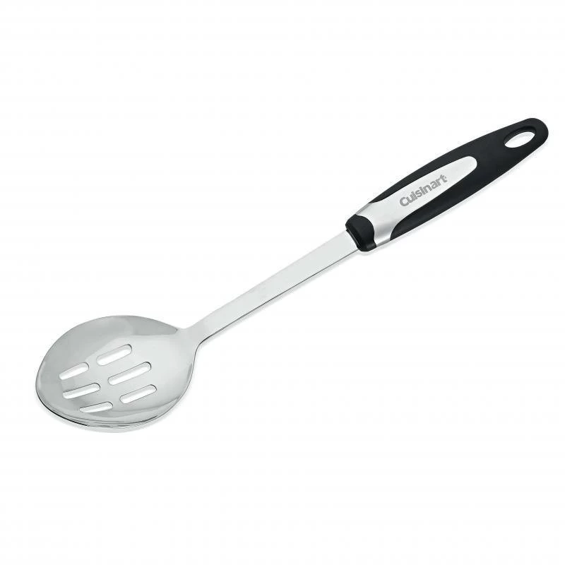 From mixing pancake batter to serving vegetable casserole, add practical style to your kitchen with this Stainless Steel Solid Spoon from Cuisinart. This 14.25-inch serving spoon features a long, curved handle, with an ergonomic grip and hanging hole making for easy use and storage.
