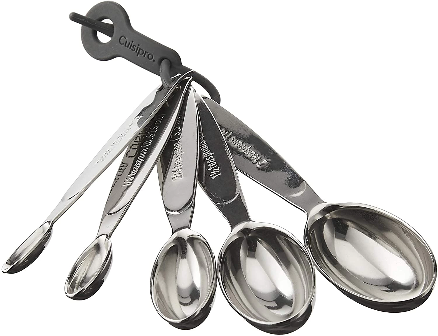 The gently curved handles curl under, so the spoons can sit securely on the counter without tipping over. You won’t have to worry about capacity measurement decals wearing off over time: Cuisipro stamps the capacity right into the handle of these measuring spoons.