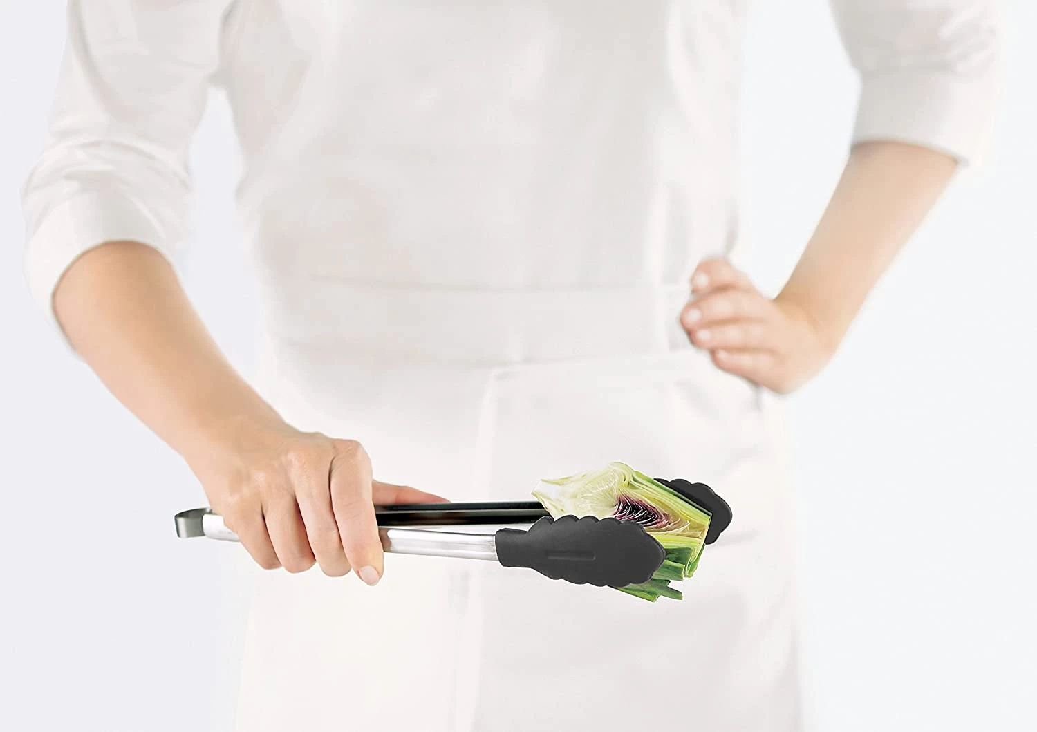 Designed to handle both cooking and serving tasks with ease. Patented locking pull mechanism. Push to open. Pull to lock. Tongs can be opened with one hand. Loop for hanging.