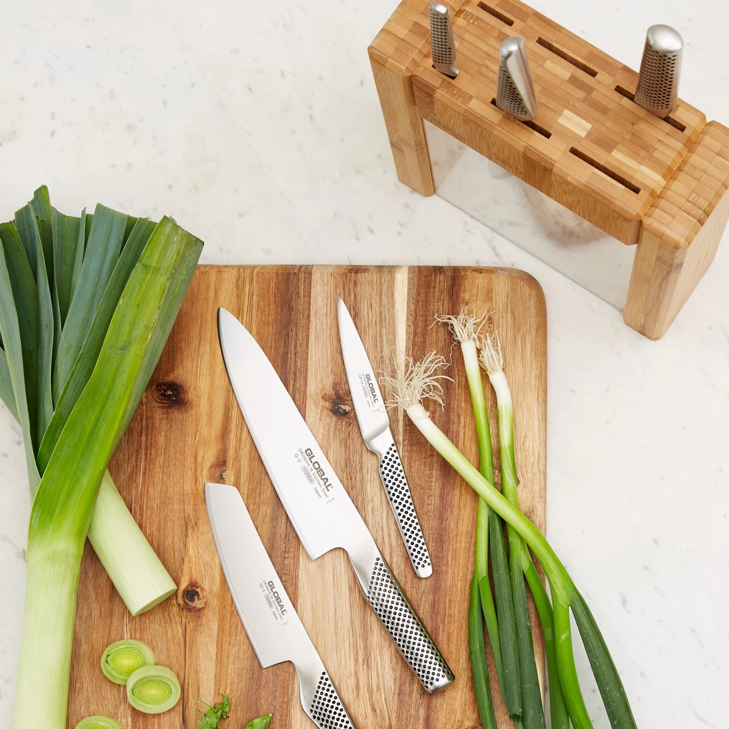 - Set includes a bamboo storage block and six knives in the following sizes: 22cm bread knife, 20cm cook knife, 14cm vegetable knife, 13cm cook knife, 11cm paring knife, and 8cm paring knife