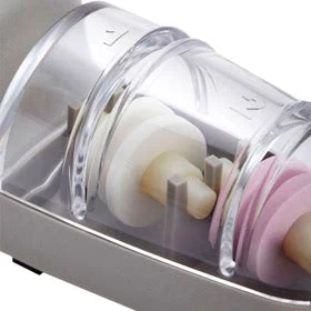 - Includescoarse (white)andmedium (pink)whetstone wheel sharpeners designed to be used with water