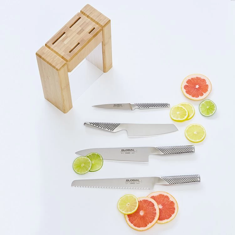 Youll be feeling and working like any kitchen expert when you have the five-piece Global Teikoku Knife Block Set on your counter. Made to ensure utmost hand comfort while making those perfect slices, these ultra-sharp blades have all your basic chopping needs covered for years to come. Even the attractive bamboo block makes a great countertop accent while keeping your knives ready for another round of delicious cooking.