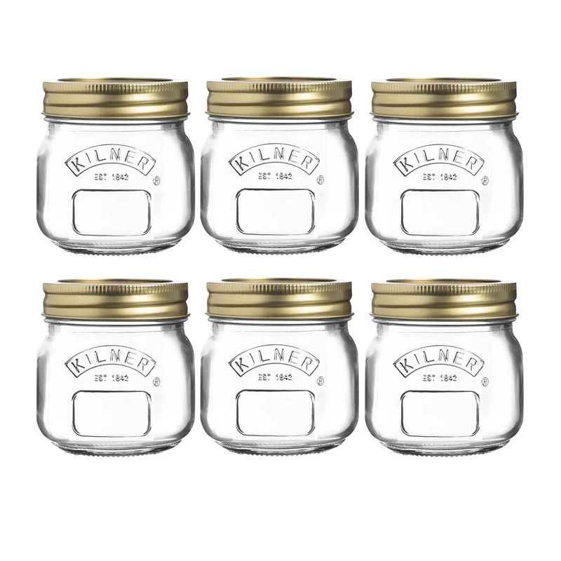 - Set includes six 250ml glass jars with two-piece metal screw top lids