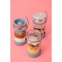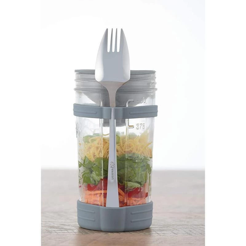 - Comes with a 500ml wide-mouth glass jar, silicone spork holder and grip base, stainless steel Viners spork & lid, and silicone garnish pot & stopper.