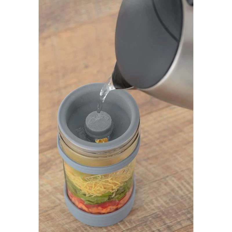 The Kilner All In 1 Food To Go Set is an innovative way to store, carry and consume cold and hot foods directly from the jar. The 0.5 Litre Wide Mouth Kilner Jar makes it easy to eat out of and the accompanying spork means it is a complete food-on-the-go set. The uniquely designed jar is ideal for making and storing homemade healthy snacks and lunches on the go. The silicone garnish pot allows you to separate sauces, dressings, or dips from the dry ingredients, keeping your food crisp and fresh. Its innovative silicone stopper creates a funnel for pouring hot water directly onto noodles. It also allows the jar to be microwave safe, as when pulled upwards, the silicone stopper helps to release steam and prevent spillages during cooking. The silicone base conducts the heat during microwaving and the handgrip holds the spork and protects hands from hot contents whilst consuming.