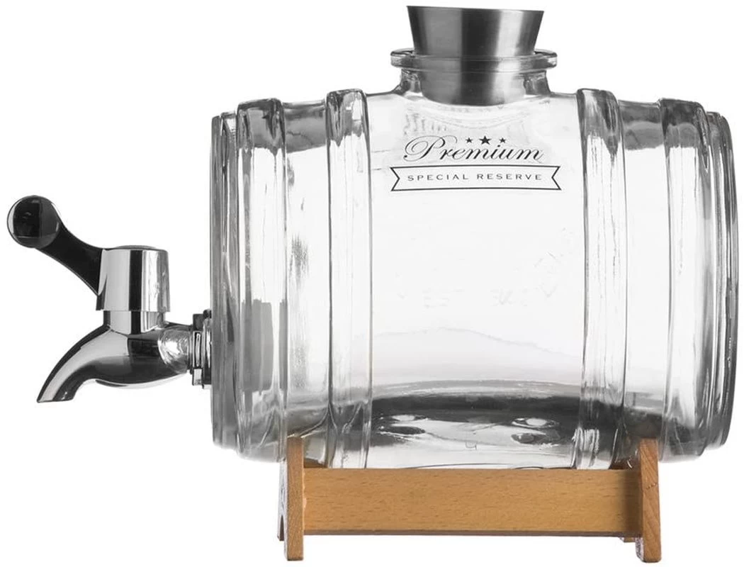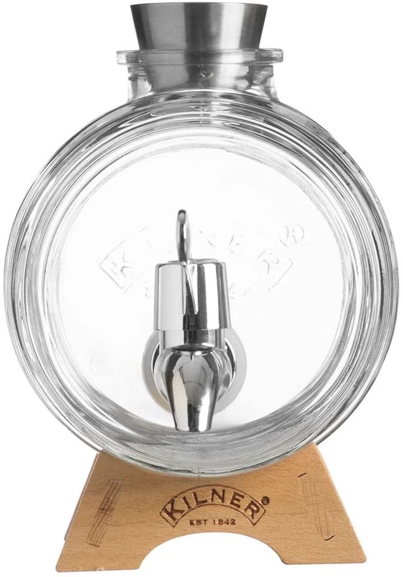 - Wooden dispenser stand with a Kilner-embossed logo keeps the barrel elevated for easy pouring