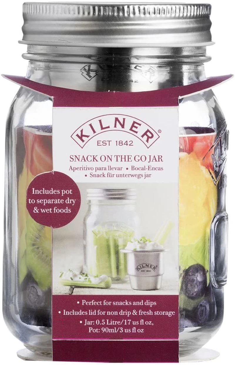 The Kilner 0.5L/17 US fl oz glass preserve jar and stainless steel pot is the healthy way to store and transport your breakfast grains or dry snacks so you can be sure that theyare kept fresh and crisp. The stainless steel cup will hold all of your liquid or wet foods separately away from the crisp dry ingredients until youare ready to mix and enjoy.