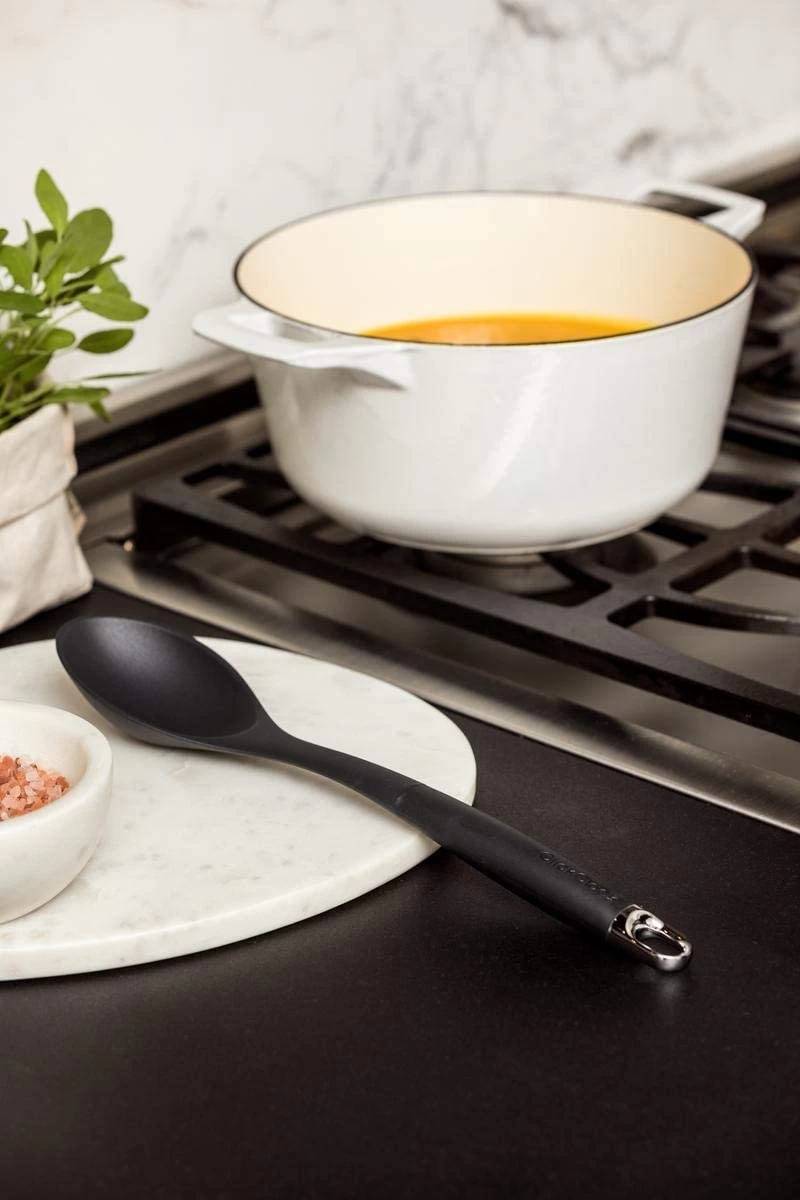 ClickClack Nylon Spoon is made from nylon material. Can handle the heat up to 200 degrees Celsius/390 degrees Fahrenheit. Safe in non-stick pans and my ergonomic handle is easy to hold. BPA-free and dishwasher are safe. Available in grey and polished chrome color.