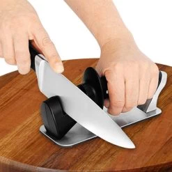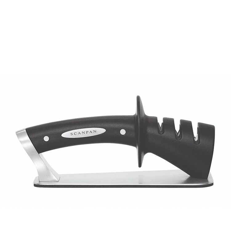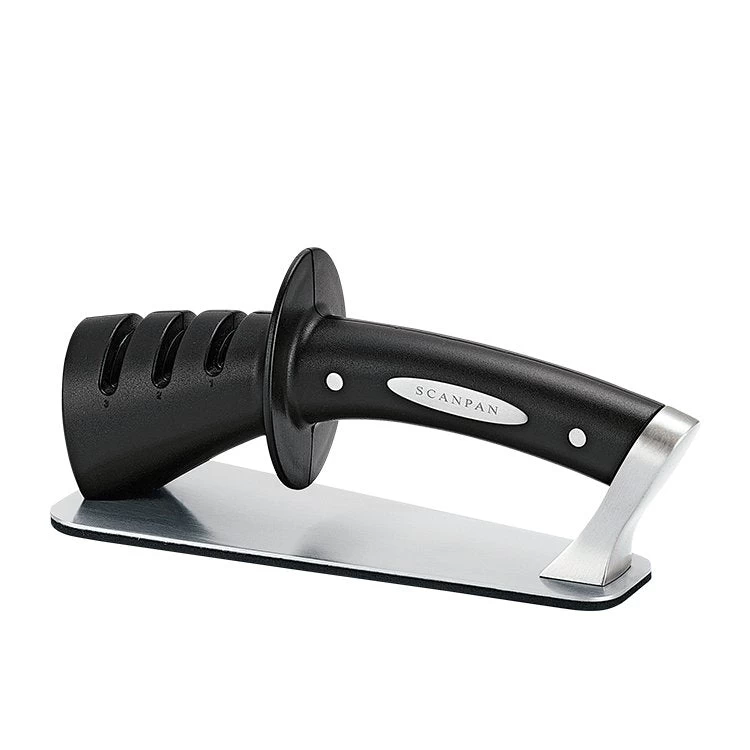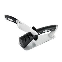 The 3 stage blade sharpener has 3 separate in-built plates – Tungsten, Diamond and Ceramic one to keep your knives in a perfect condition and ready at any time. The tungsten sharpening plates remove any small burrs and nicks on the blade, creating a smooth overall surface for further sharpening. The diamond sharpener creates a finer edge, preparing the surface for the final stage of sharpening, the ceramic sharpening plate, which creates a razor sharp edge by polishing the blade into a very fine point.