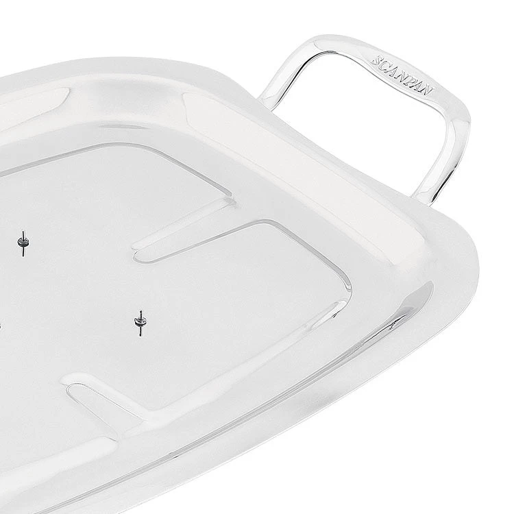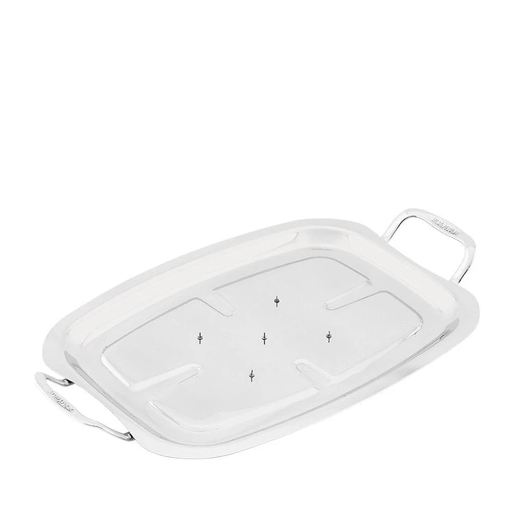 This stainless steel Carving Tray from Scanpan is just the thing to keep your roasts in place while carving them. Spikes on the bottom of the tray will ensure your meat doesn’t slip around, while two handles allow convenient lifting and carrying. Dishwasher safe, covered by a 10-year warranty.