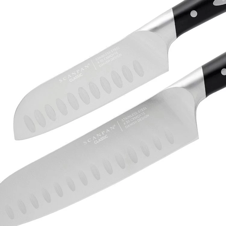 Chopping, slicing, and dicing ingredients of any size are made easier with this two-piece Scanpan Classic Santoku Knife Set in your collection. Made to comfortably fit your hands for better grip, these razor-sharp blades are a joy to work with whenever you are whipping up a quick stir-fry or saute. And with special Granton dimples along their edges, every cut is guaranteed to be effortless, without food sticking to the blade.