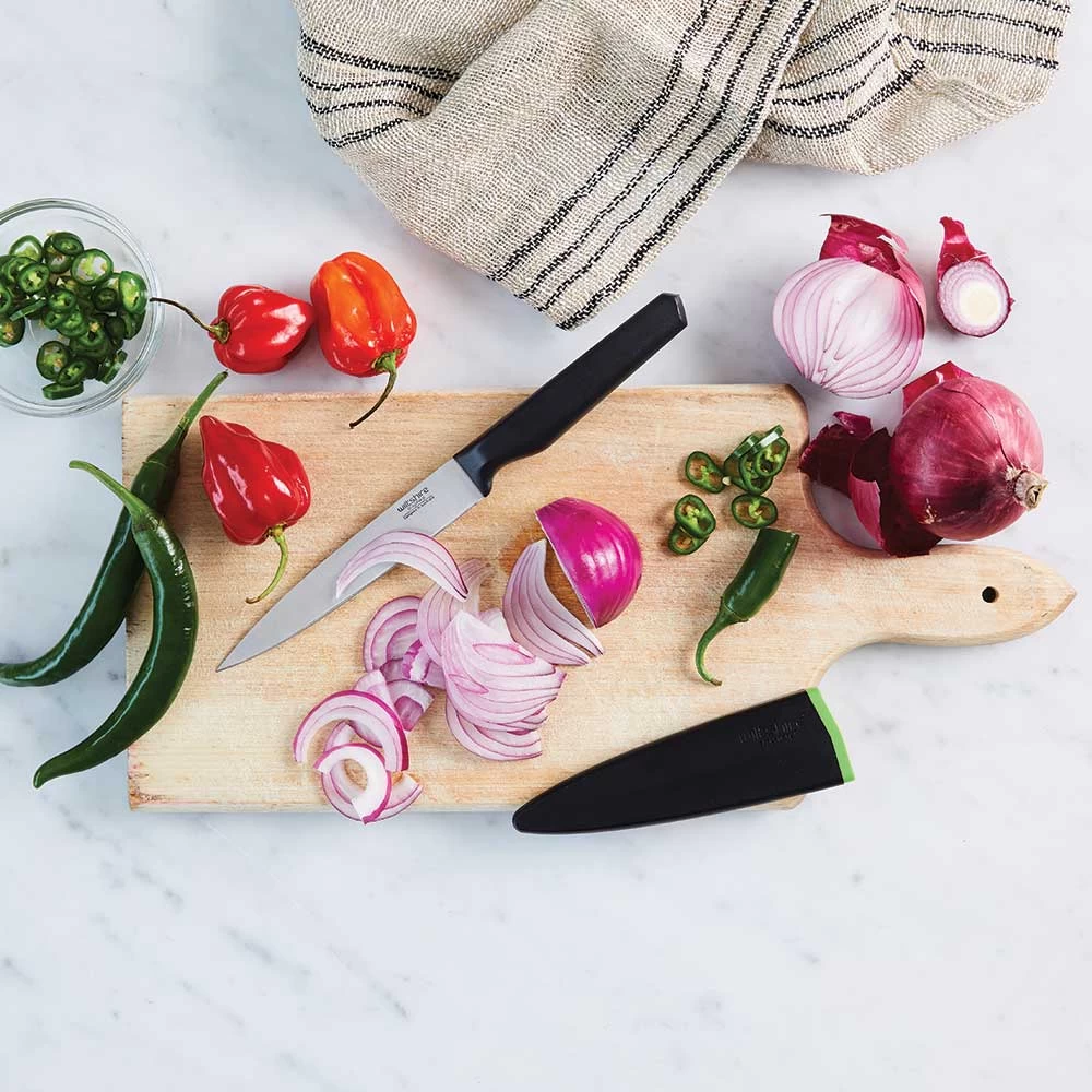 Perfect for cutting fruit and small vegetables and a variety of herbs, this knife makes light work of food preparation with its Staysharp blade. Thanks to the patented self-sharpening system you can ensure no more blunt knives.Cheese prefers it. Even fancy fruit and herbs favour it. But don’t let its size fool you. The Staysharp Utility Knife is your handy, all-purpose knife for those fiddly food prep jobs. When the paring knife is too short and the chef’s knife is too big, this utility knife packs a punch. It perfect for peeling, cutting, slicing and trimming meat, fruit and vegetables. Thanks to the clever self-sharpening system of Staysharp you can ensure no more blunt knives. Simply insert and withdraw the knife from the scabbard for a sharp knife every time. But don’t just use it in the kitchen, this knife is great at picnics and on holidays too.