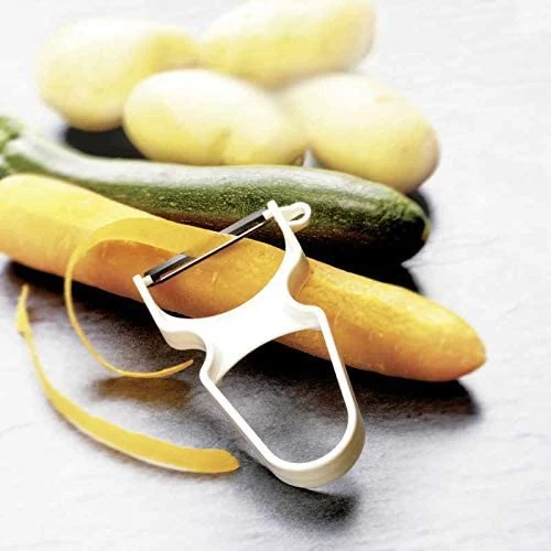 The Victorinox White Plastic Rapid Potato Peeler is a classic in the restaurant kitchens and many homes. This kitchen tool is used to peel several vegetables, usually potatoes, carrots and fruits. The inside edge is sharpened while the external side prevents the blade from cutting too far into the vegetable. Good grip and comfortable to work with.